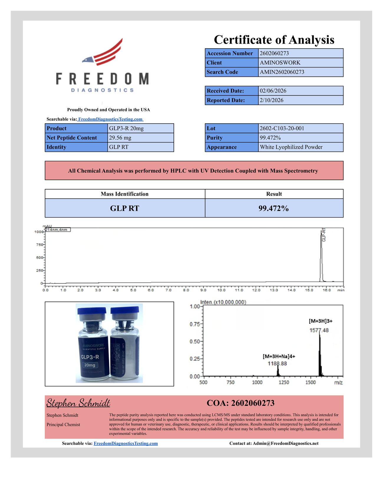 Every peak, every mass — cropped directly from the Freedom Diagnostics PDF for this lot. Nothing reconstructed. Nothing synthetic.